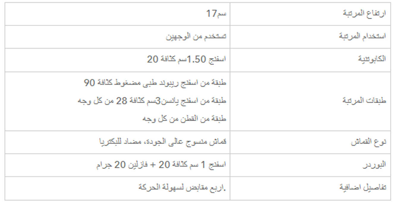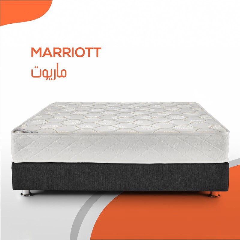 هى نوع مختلف من المراتب لمن يعاني من ألام في الظهر و الرقبة ، ماريوت مزيج من السفنج العالي الكثافة ( الطبي ) و طبقه من القطن ، فهي تعطيك الثبات في النوم مع الدعم لفقرات الظهر هى عباره عن شاسيه من الاسفنج الطبى المضغوط ليضمن عدم حدوث اى هبوط فى المرتبه باالضافه انها معالجه ضد الصدأ طبقه من اسفنج ربيويد طبى مضغوط كما نحتوى على اسفنج يانسن وطبقه القطن التى تجعل المرتبه اكثر راحه طبقه اللباد قطن مضغوط حراريا يعمل كعازل بين طبقات الاسفنج وطبقات االسفنج طبقه اسفنج 1.5سم كثافه 20+طبقه طبقه اسفنج يانسن 4.5 كثافه 28 وجه طبقه قطن من كل وجه كما تحتوى على وجهين لراحه اكثر طبقه اسفنج ربيوند طبى مضغوط كثافه 90 اسفنج1سم كثافه 20+فازلين 20 جرام قماش دبل نت المعالج ضد البكتريا وحشرات الفراش فتحات التهويه موجوده على جانبى المرتبه وزعت بطريقه مدروسه لضمان التهويه الجيده والكامله داخل المرتبه مما اليدع اى مجال لروائح كريهه او تعفن داخل المرتبة.